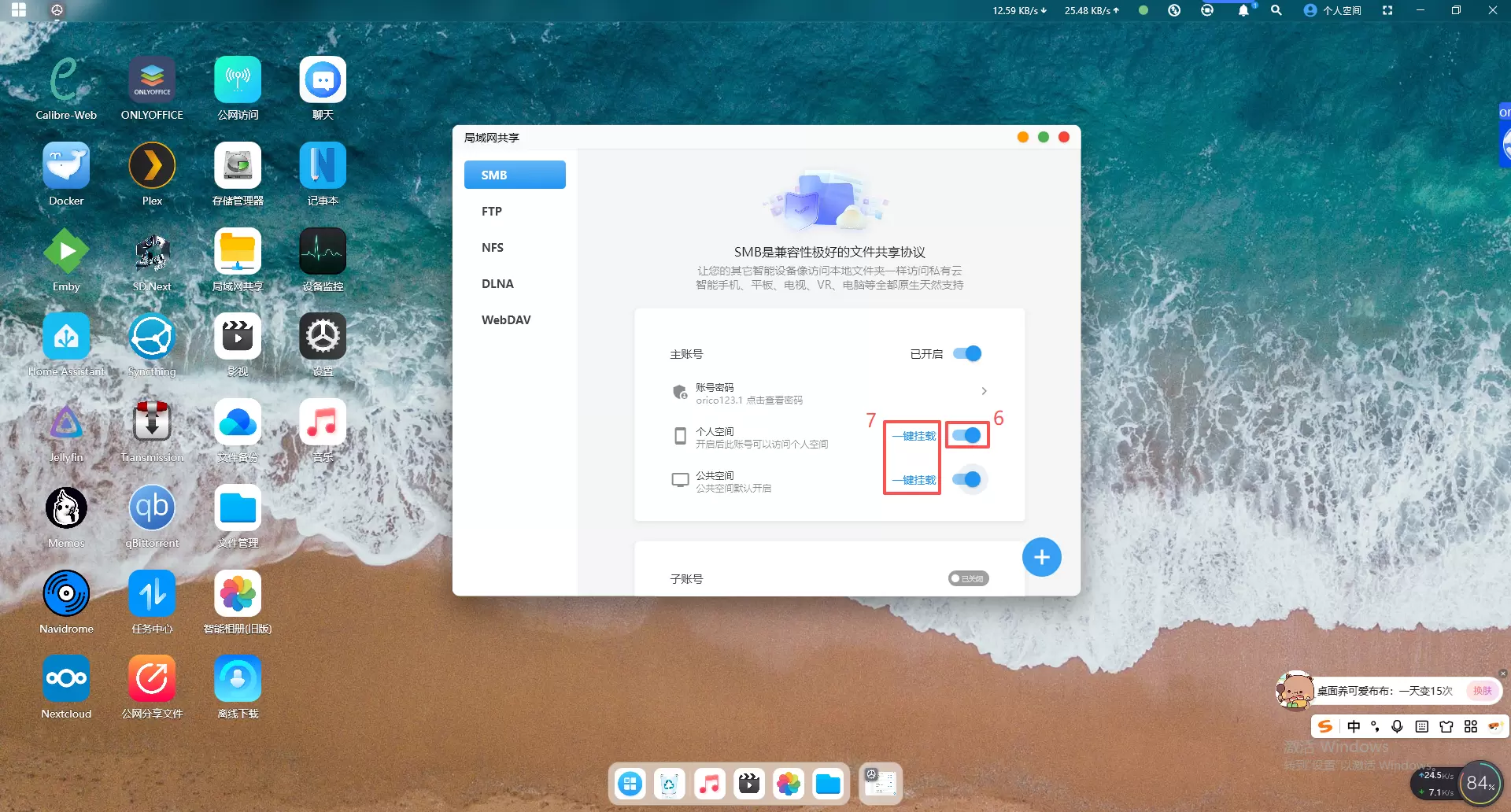 3、创建好账号之后,主账号和公共空间访问默认自动打开,个人空间需要手动打开。同时可以点击"一键挂载”实现存储路径的挂载到电脑上。
