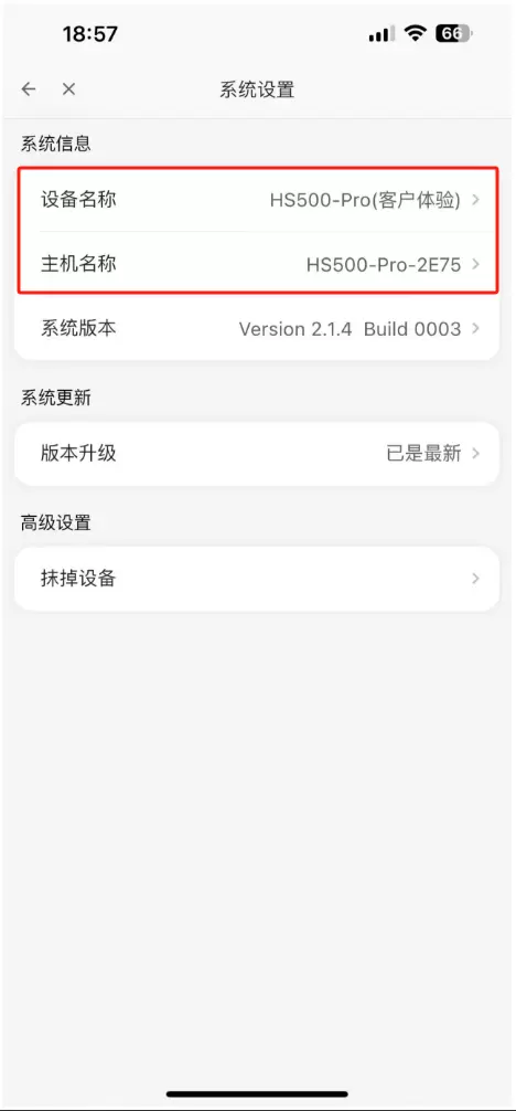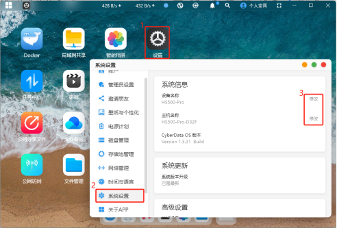 1.点击首页的“设置”,选择“系统设置”,进到系统信息界面。 点击设备名称或者主机名称后面的“修改”字样进行名称修改。