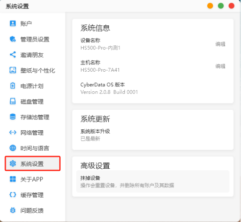在系统设置界面可以修改设备名称和主机名称,也可以查看到目前的系统版本,并对设备进行升级。在高级设置里还可以对设备进行抹掉处理。