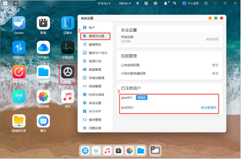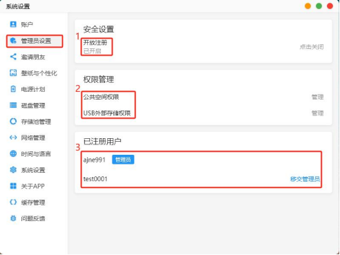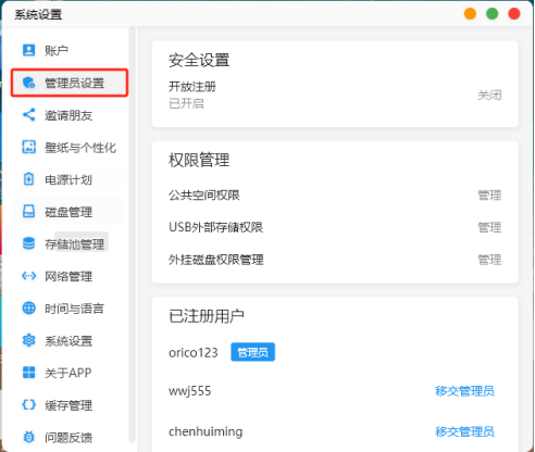 (1)目前默认第一位注册的用户为管理员,管理员可以在“系统设置”对设备进行管理。 (2)“安全设置”中的开放注册默认为开启状态,如需暂停用户注册,可点击关闭。 (3)“权限管理”中的公共空间权限和 USB 外部存储权限可选择对部分用户进行限制访问。 (4)“已注册用户”目前可以查看到设备注册人数,还可以进行移交管理员操作。