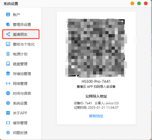 在邀请朋友界面,可以生成设备邀请二维码和公网导入地址,以便分享设备给其他人使用。