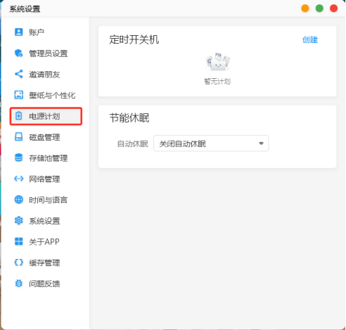 管理员账号的“系统设置”界面比普通用户多了四个页面,分别为管理员设置、邀请朋友、电源计划和系统设置。