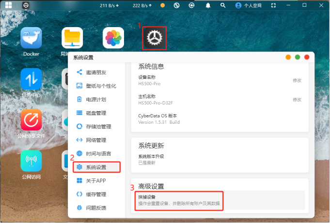 (1)点击首页的“设置”,选择“系统设置”,进到系统信息界面。在“高级设置”目录下点击“抹掉设备”。