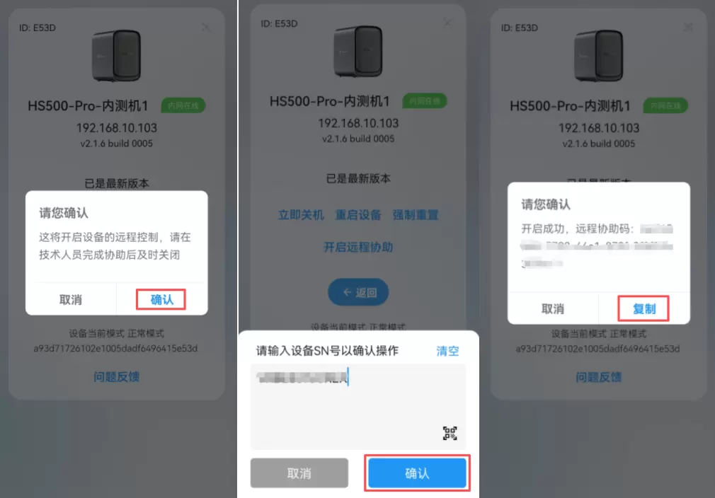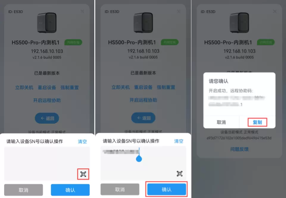 扫描设备机身上的二维码获取SN码-确认-开启成功后复制远程码给技术人员。