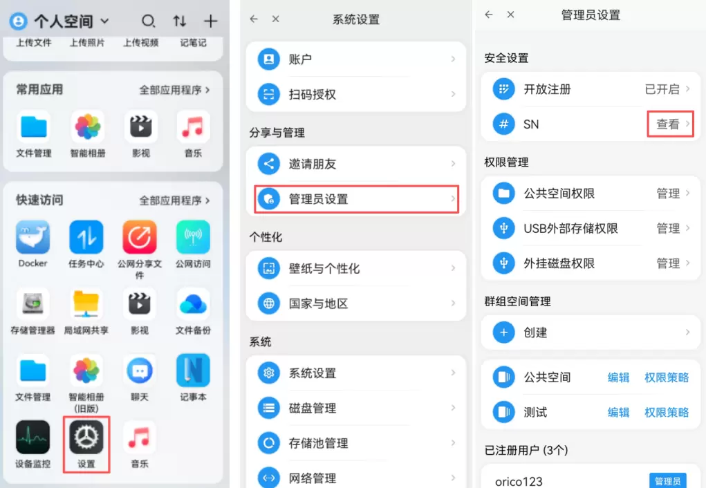 打开赛博云空间APP-设置-管理员设置-SN查看。