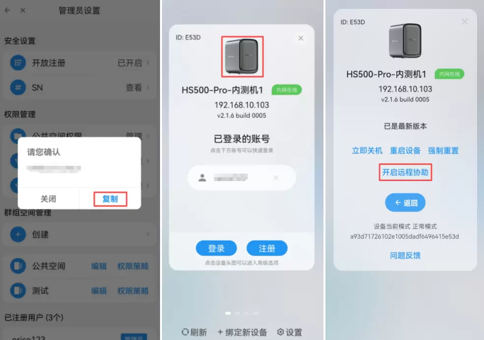 复制SN码-切换账号或设备后,点击设备图片-开启远程协助。