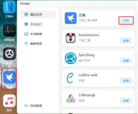 点击“启动”后容器运行成功,按钮相应的也变成了“打开”,同时在桌面也生成了一个“迅雷”的图标。