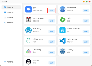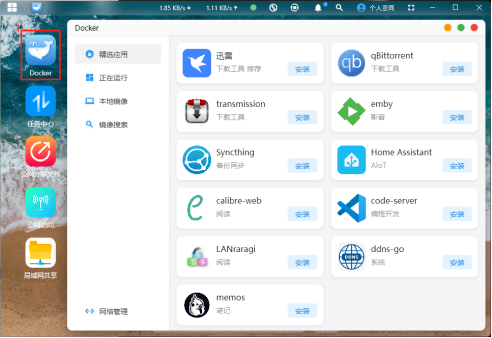 点击首页的“Docker”,进到Docker应用界面。 在“精选应用”可以看到一些设置好默认参数了的Docker容器,只需点击安装即可使用。