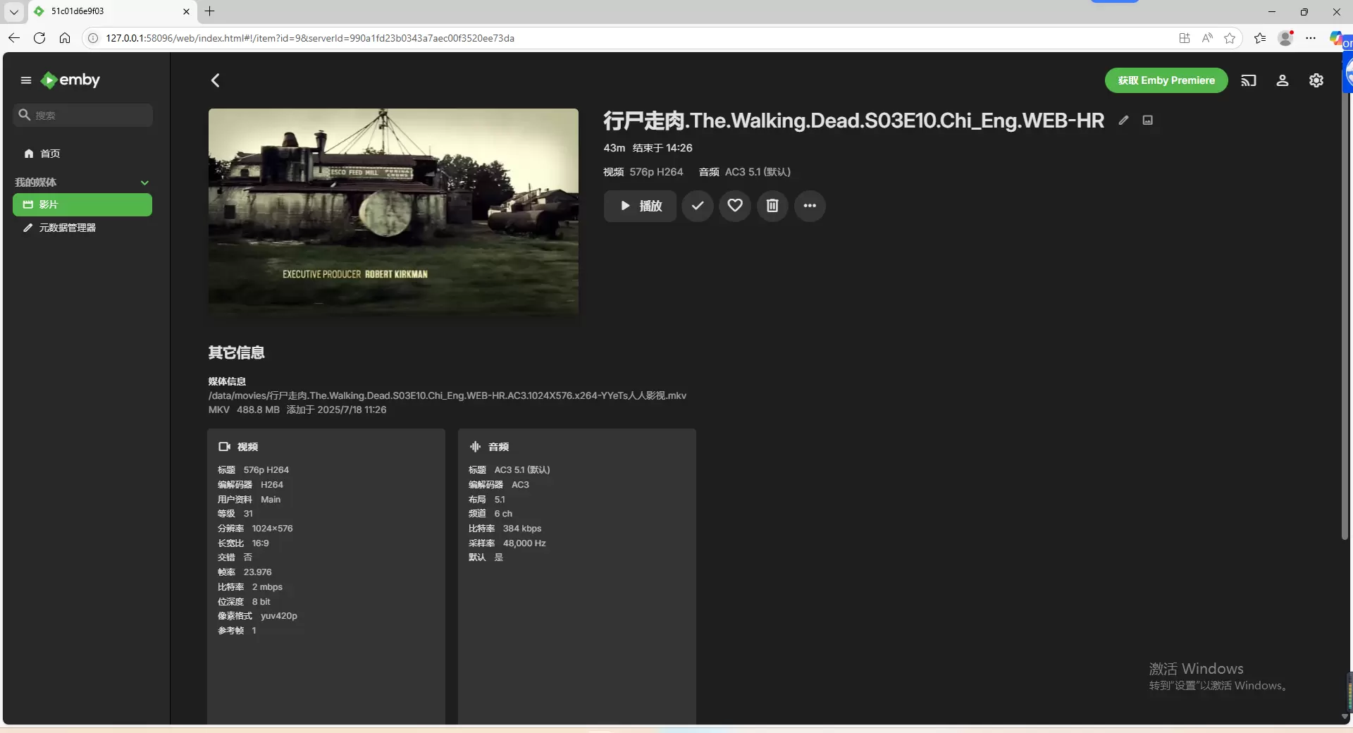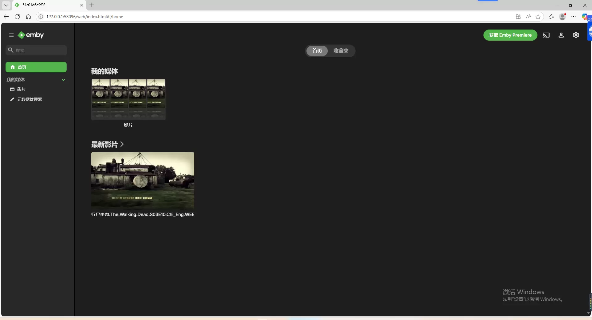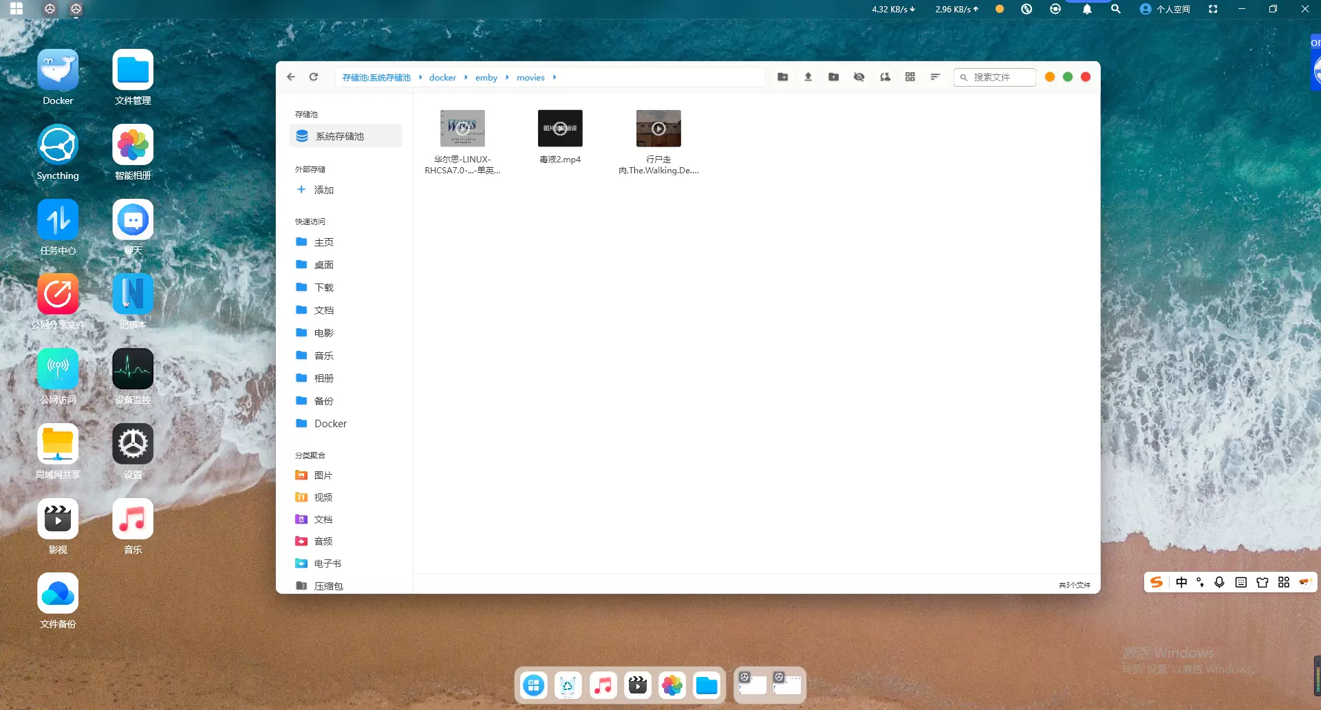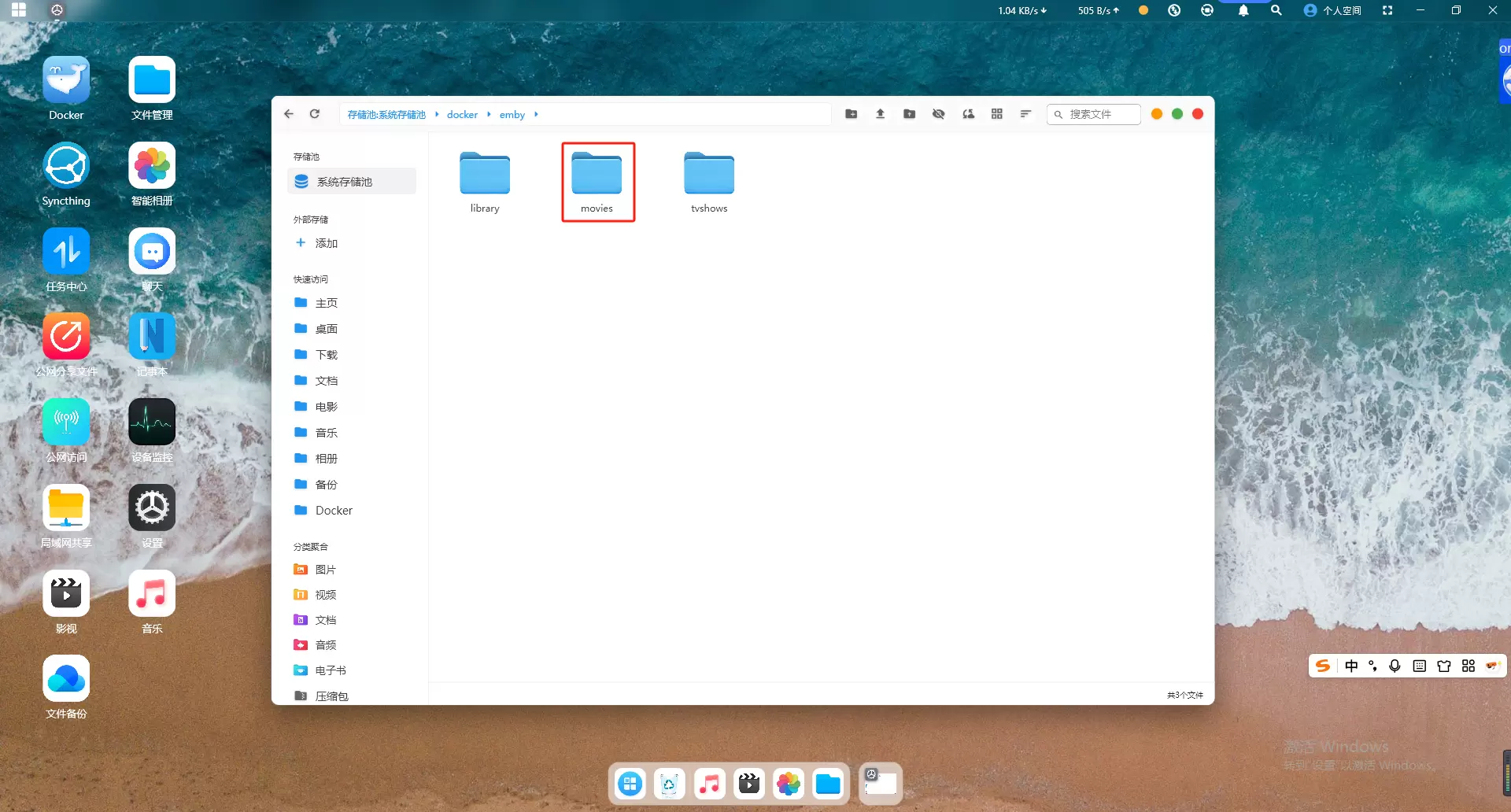 2.进入目录后选择movies,把影片放到该目录下,再回到Emby主页就可以看到刚放入的影片