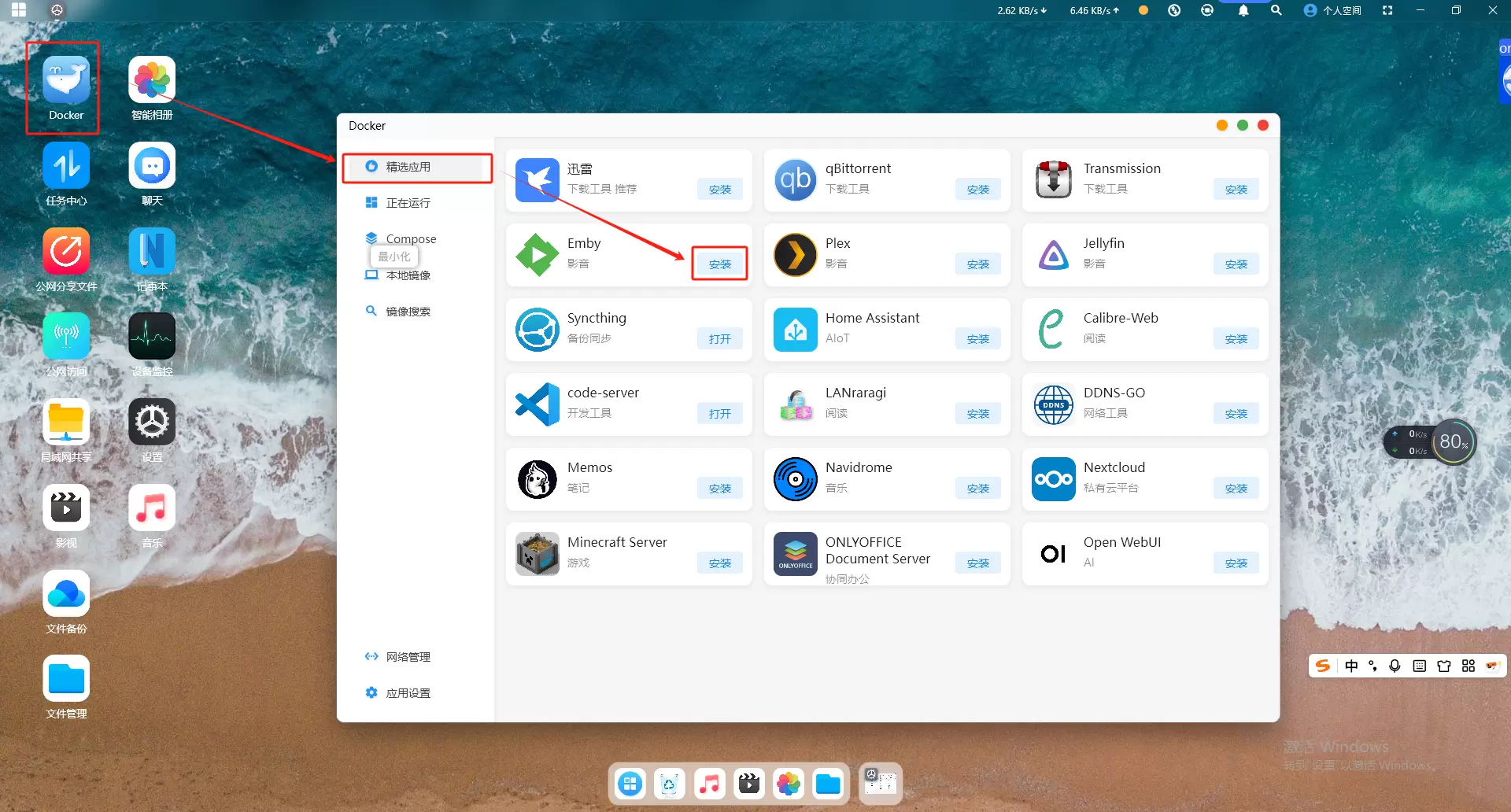 1.进入赛博云软件页面后,单击docker打开“精选应用”页面,点击Emby旁边的安装按钮下载镜像