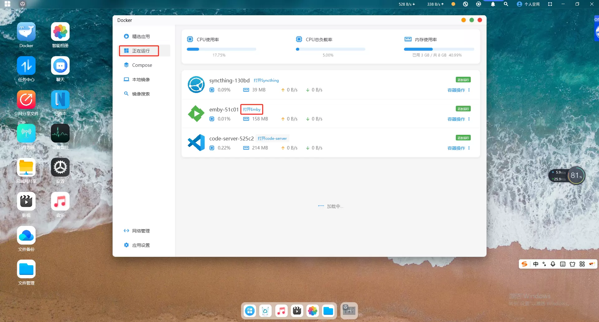 2.下载成功镜像后可以在“正在运行”中看到Emby镜像正在运行,点击打开Emby