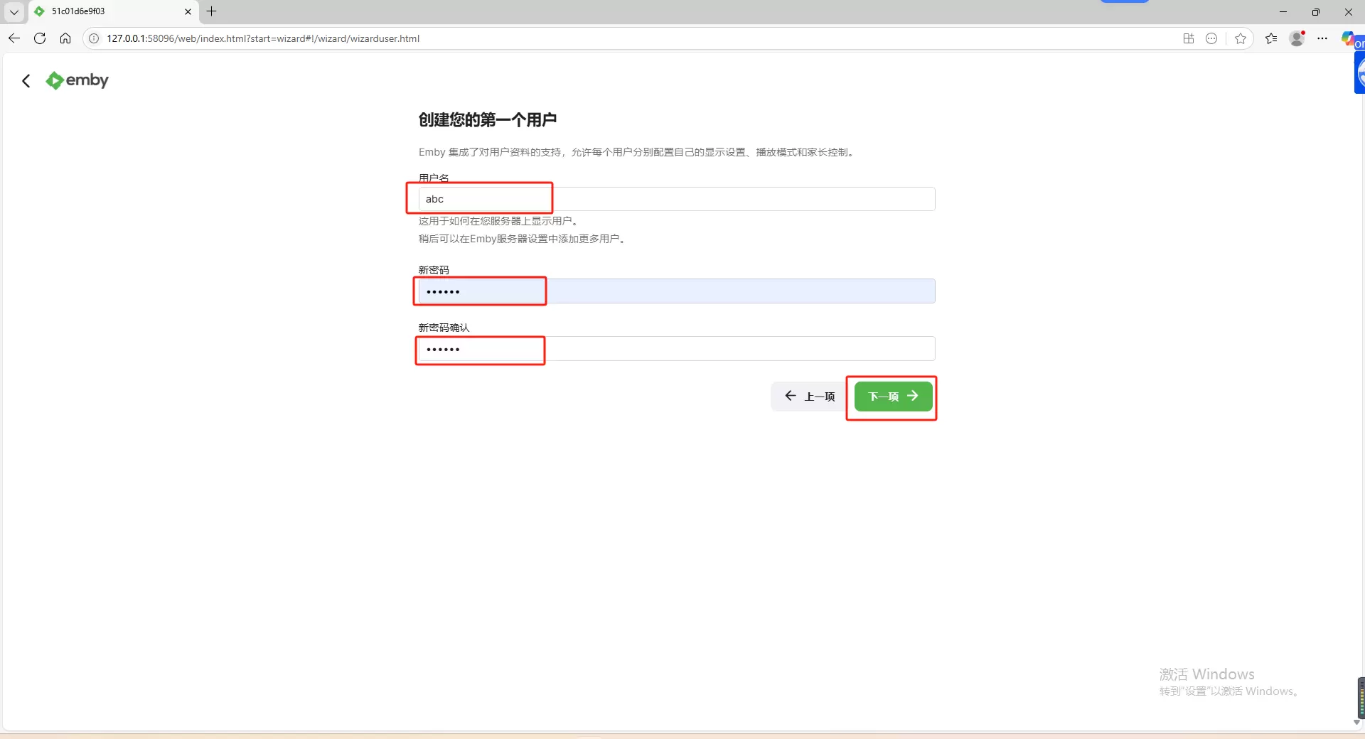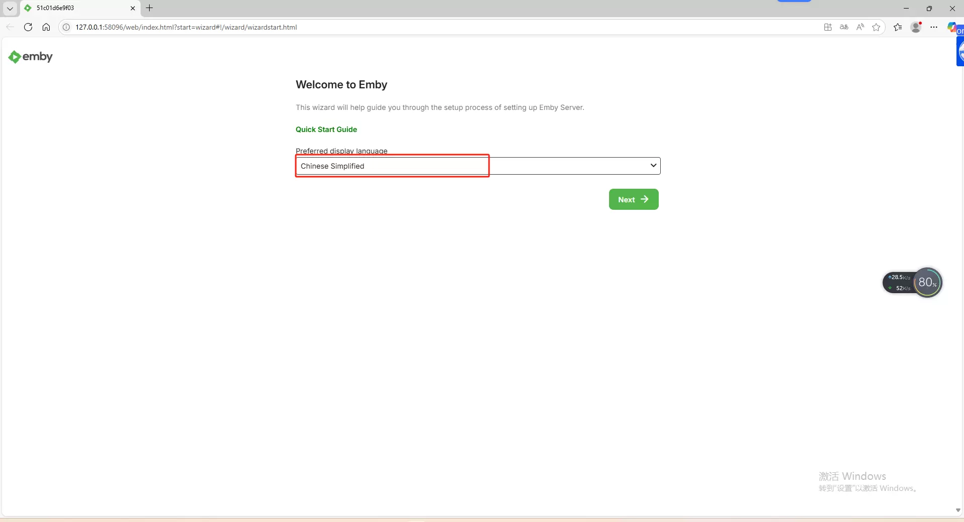 3.点击打开Emby后会自动跳转至web页面,选择好自己需要的显示语音,点击“next”