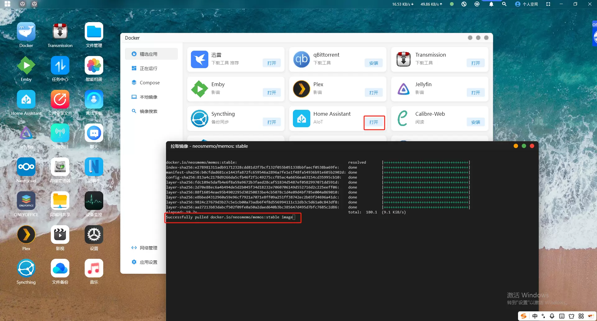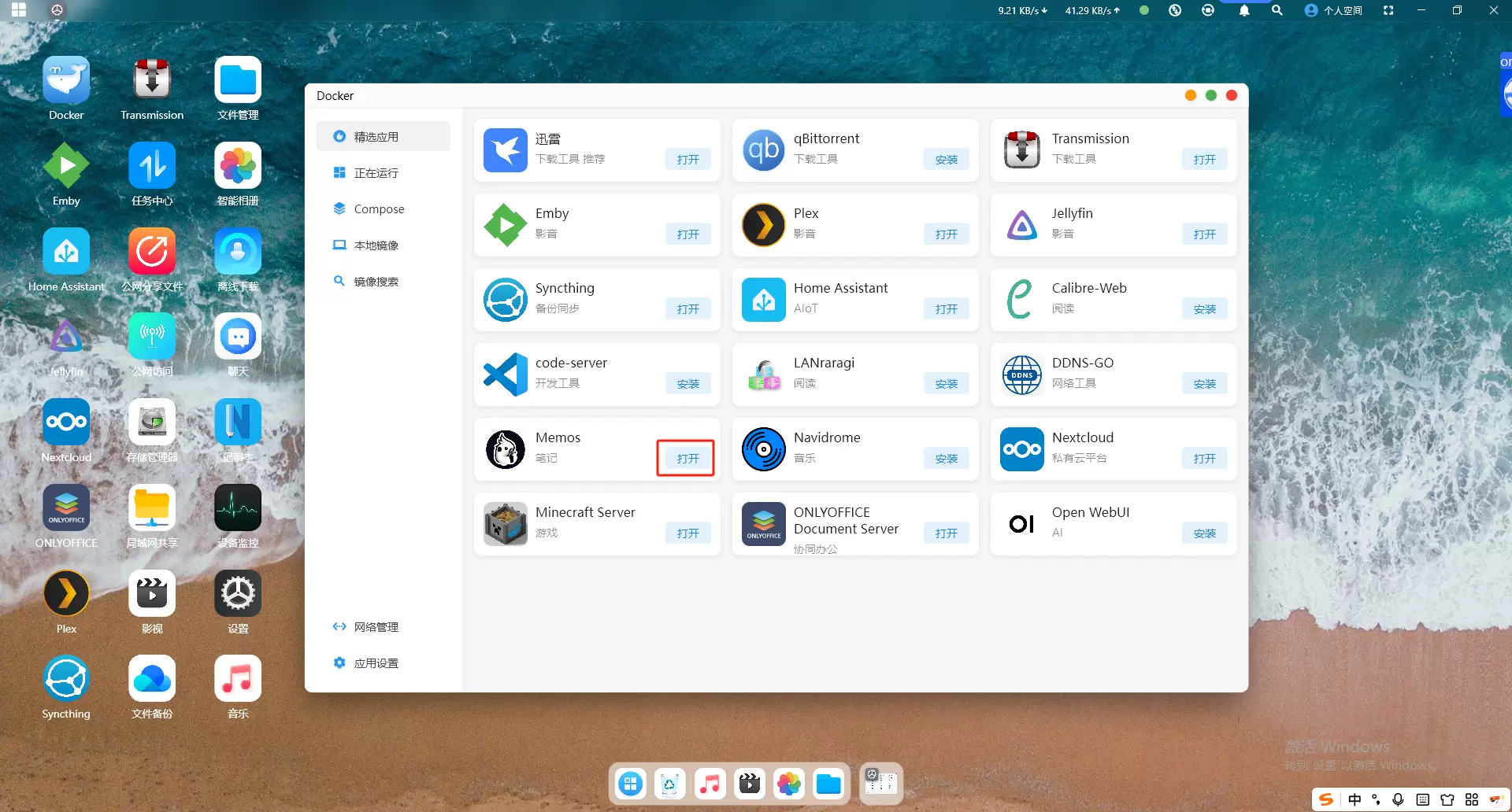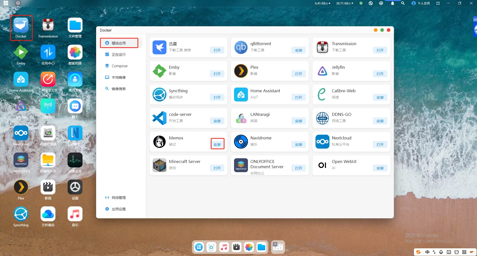 1、打开赛博云软件,单击docker应用,在弹出的docker页面点击【精选应用】选择Memos旁边的安装按钮拉取镜像
