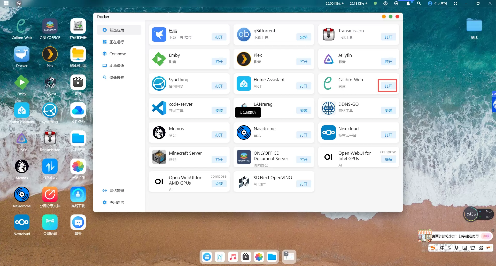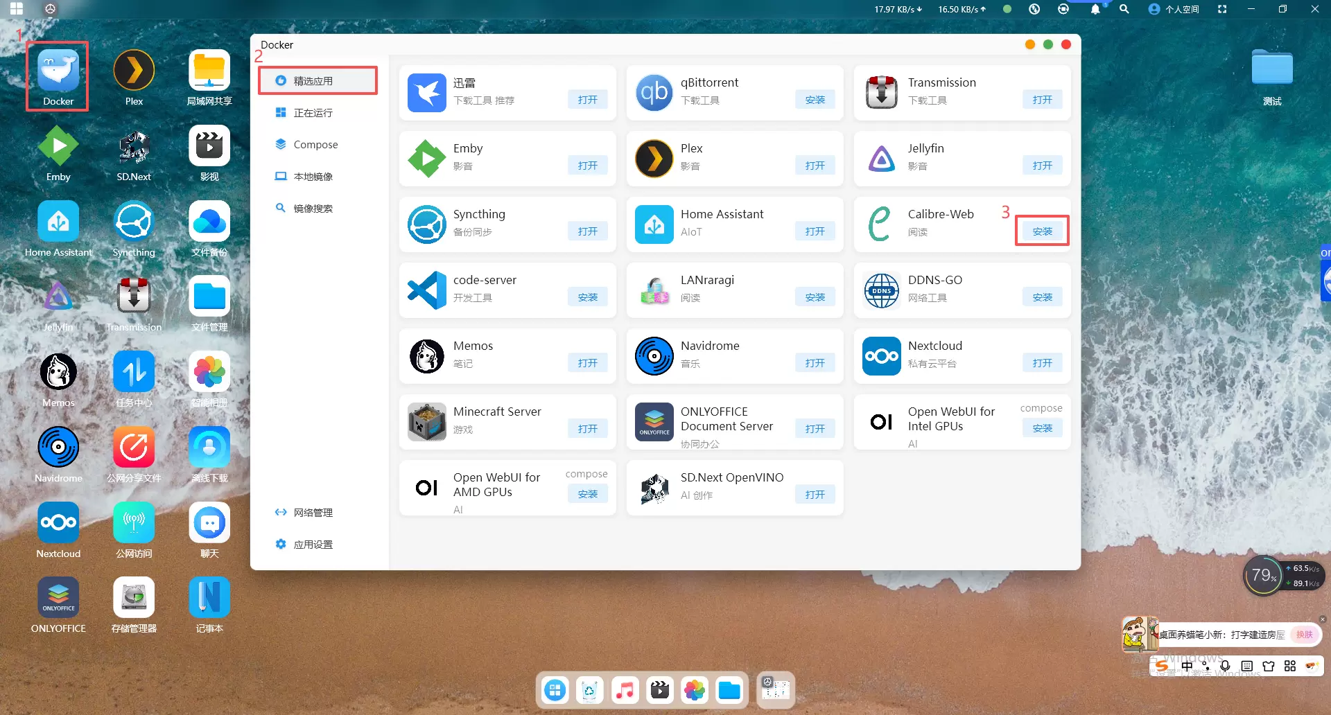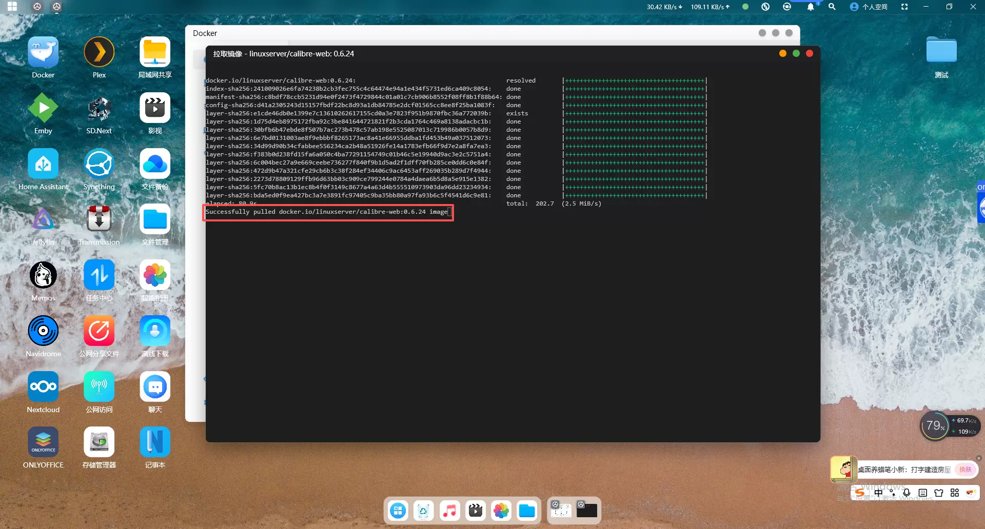 打开赛博云软件,单击docker应用->精选应用->Calibre-Web点击安装下载镜像,镜像下载完成后会在最后一行显示“successfully pulled...”,再点击开始按钮启动容器