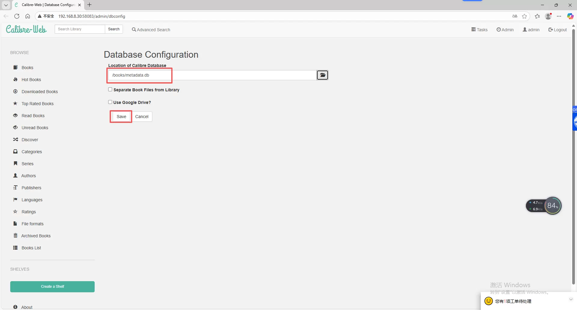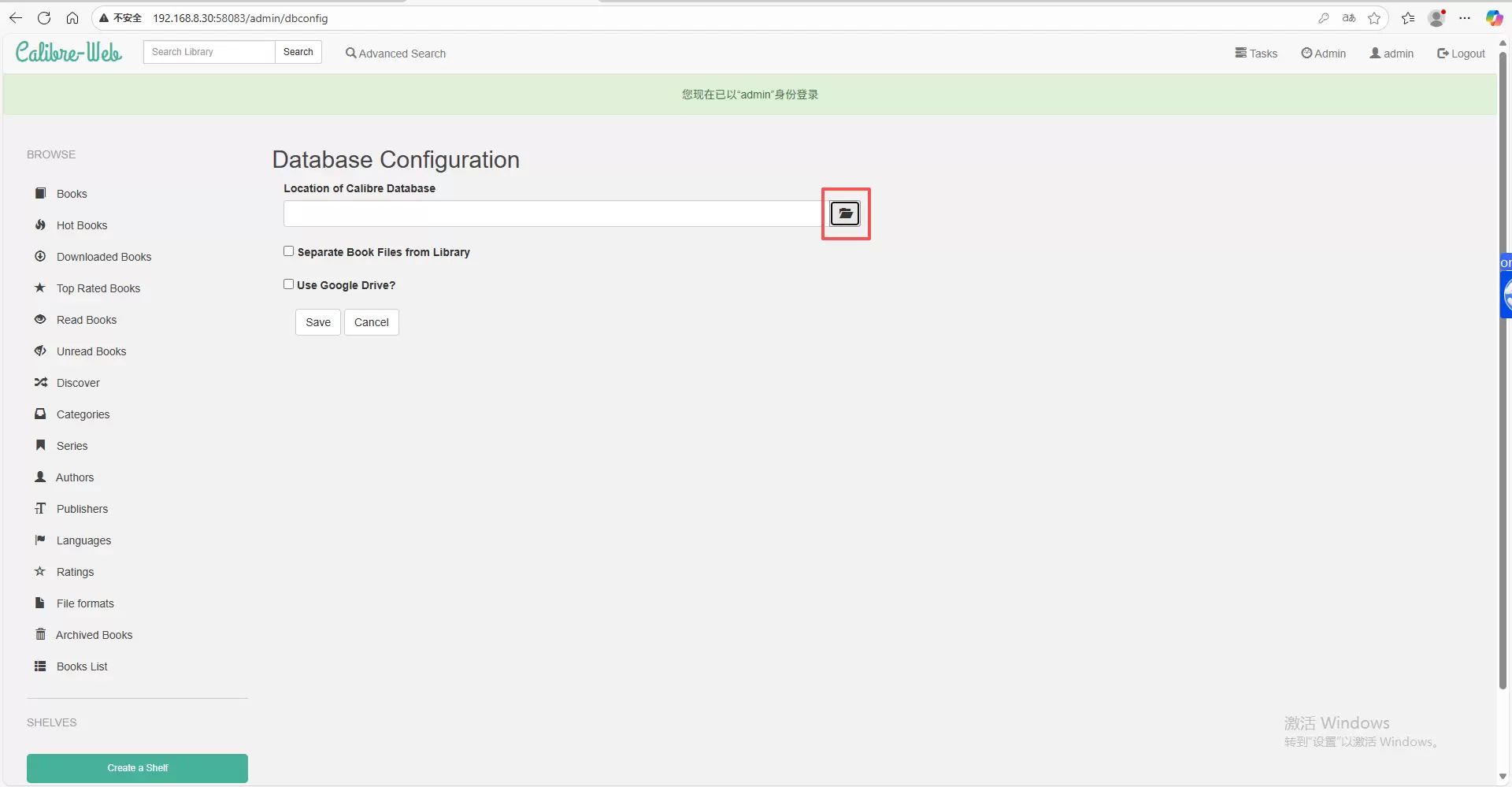 使用默认账号密码登录后,在使用前还需要添加数据库路径,点击右侧文件夹图标,依次按下图操作选择,最终的目录如下/books/metadata.db,点击下面的Save即可。