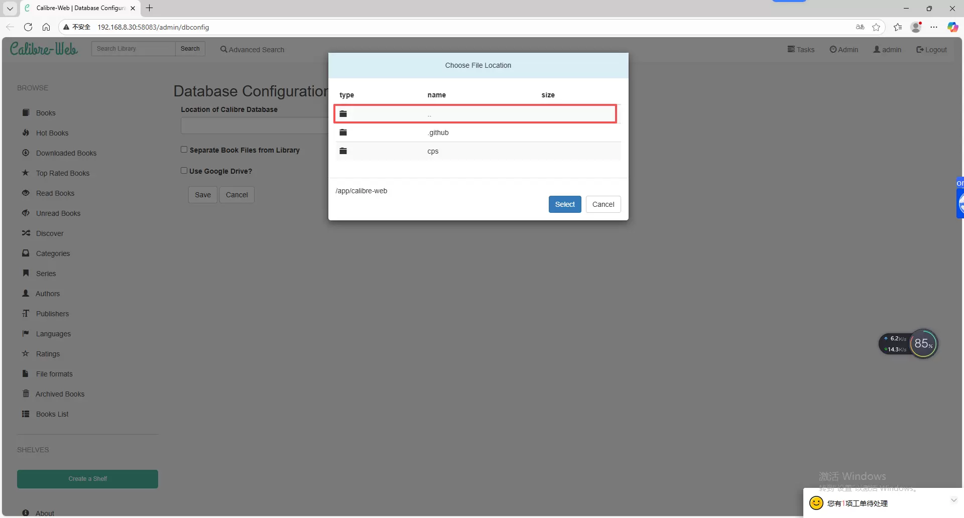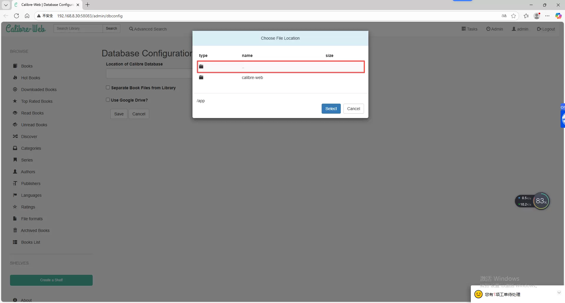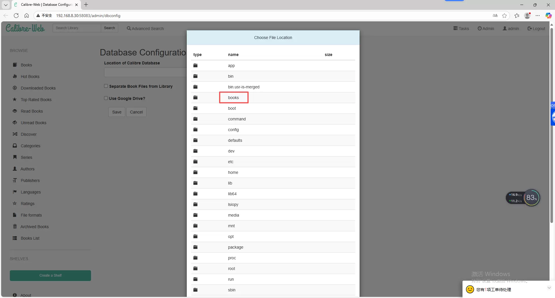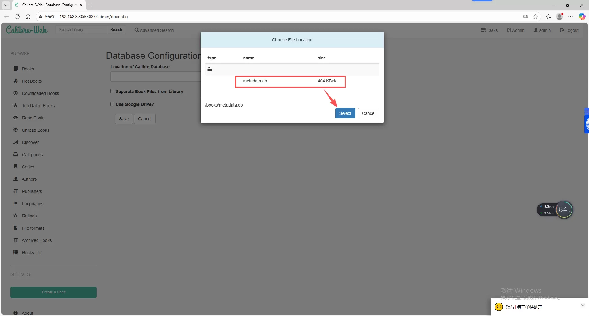 然后在web页面中选择数据库文件/books/metadata.db后即可正常使用;