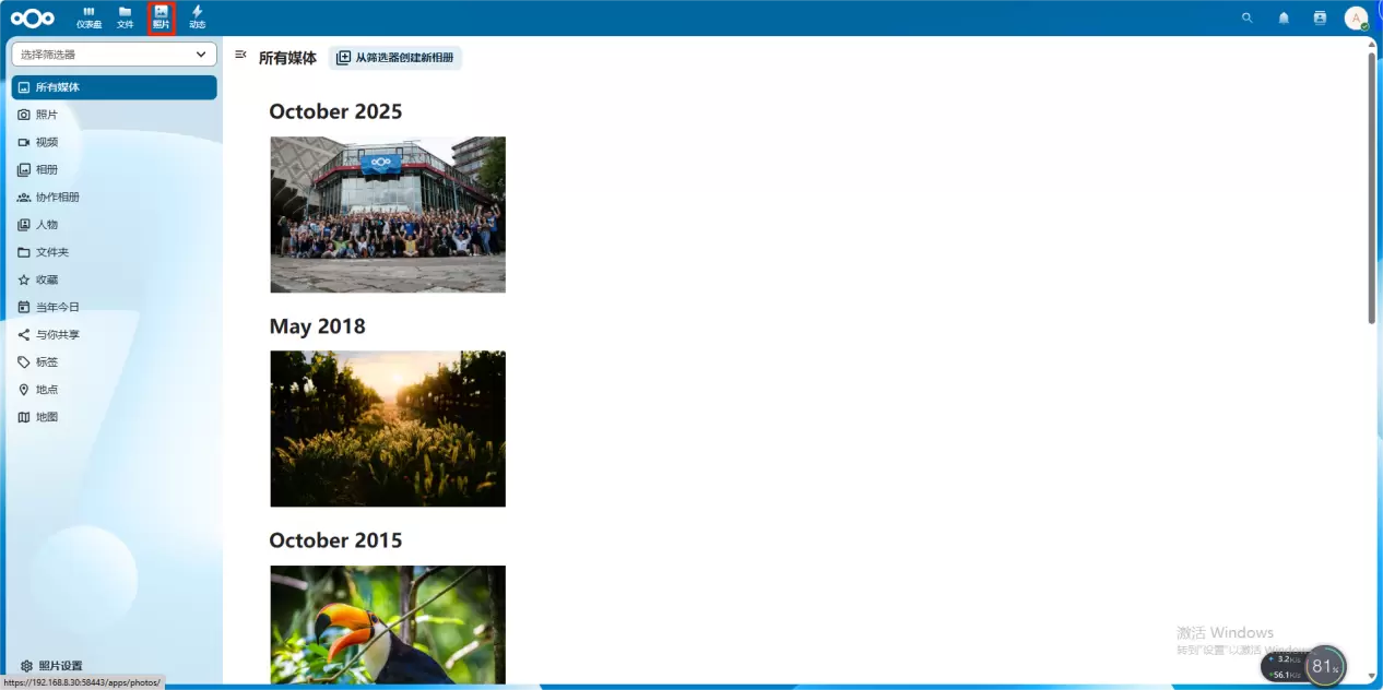 7、鼠标移到左上方点击照片模块,即可查看到所有的图片和视频文件