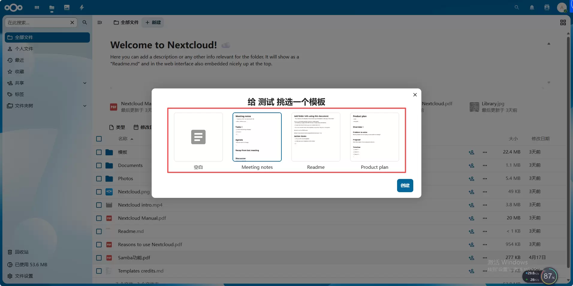 命名后会有模块供挑选,这里以空白模版为例,选择空白模版创建会自动打开编辑页面,编辑好内容后点击右上角【 √ 】,再点击右上角的【 × 】,再回到列表可以看到新创建的文件