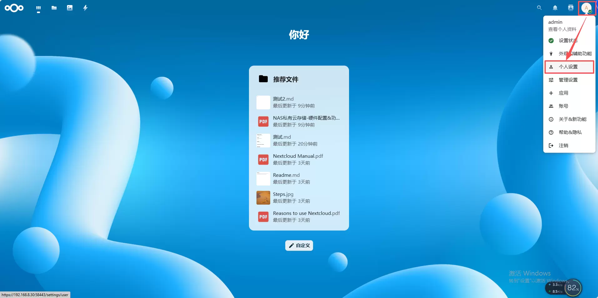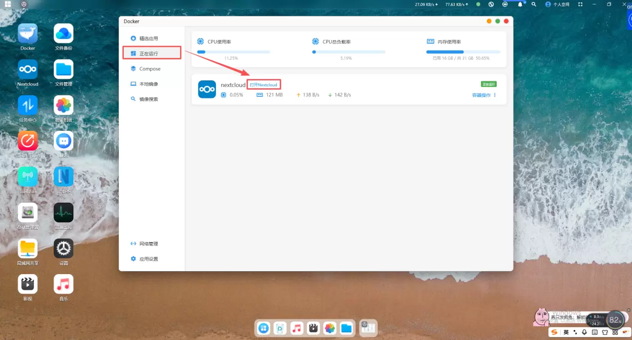 2、点击“正在运行”找到拉取的nextcloud镜像,点击“打开nextcloud”进入web界面