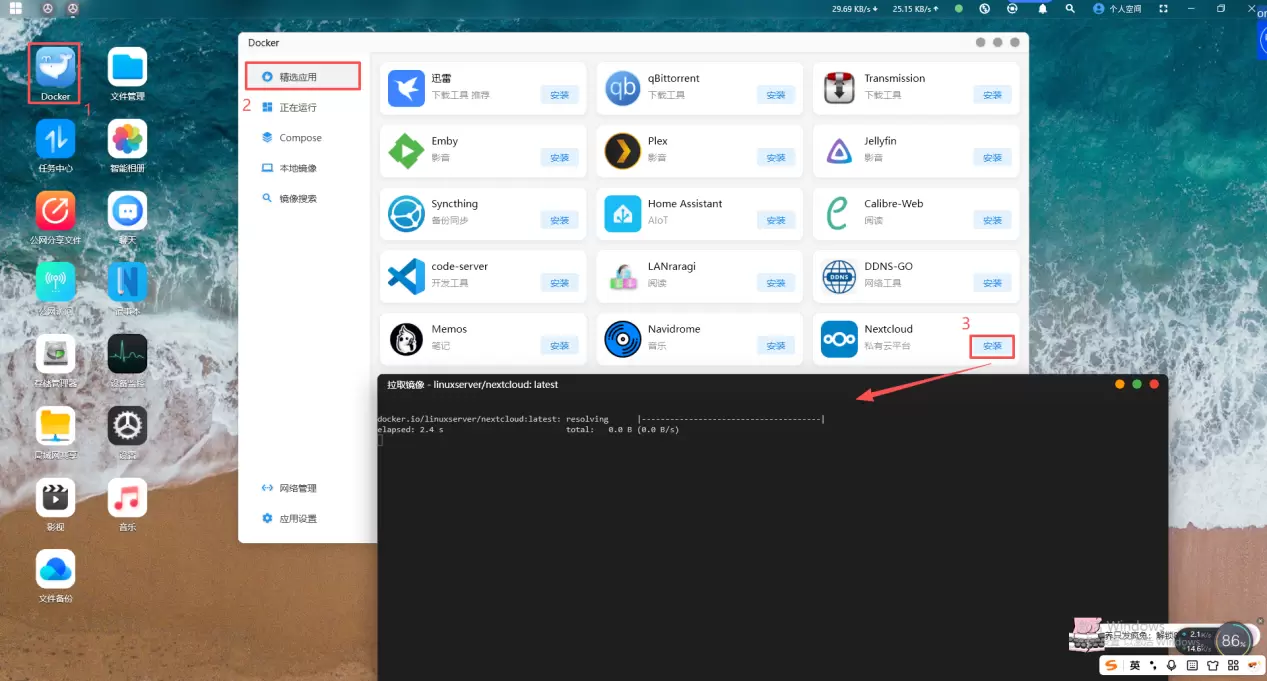 1、打开赛博云软件,单击docker应用->精选应用->nextcloud点击安装下载镜像,镜像下载