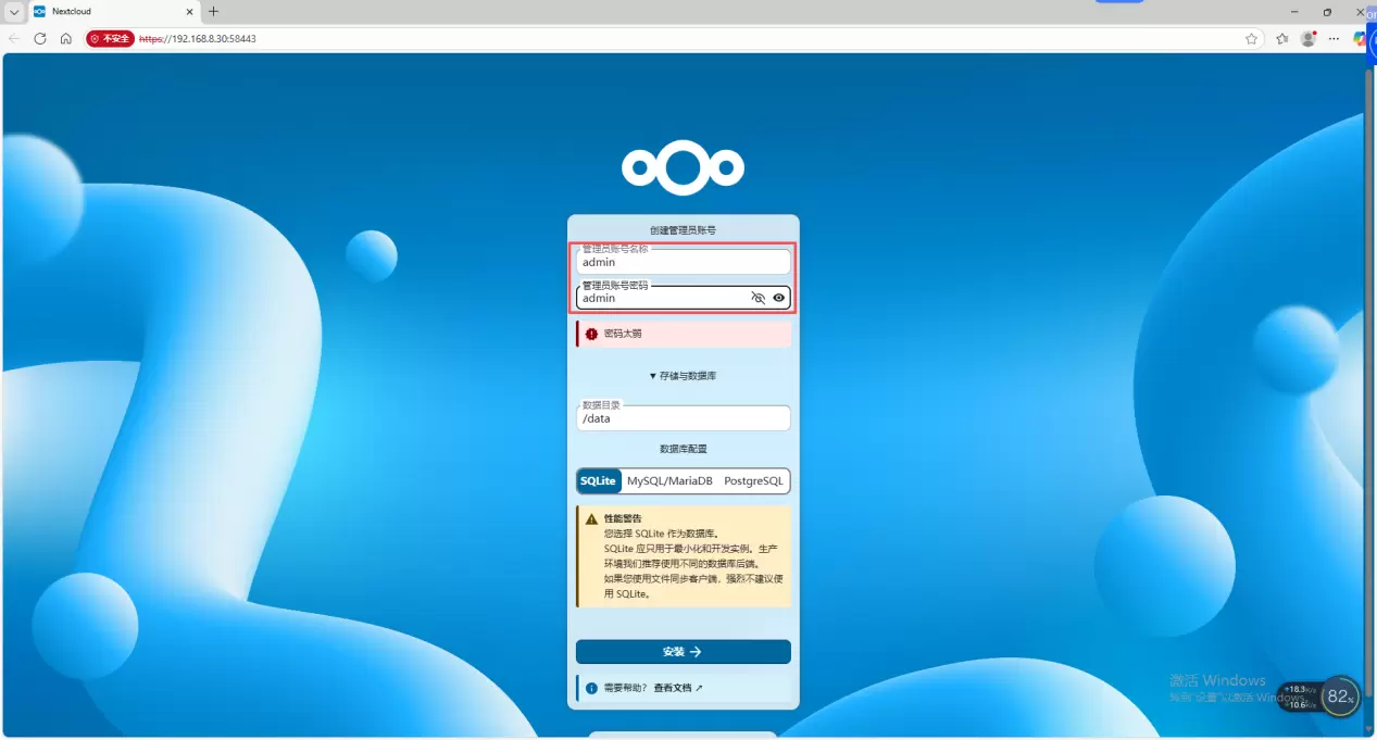 3、进入web界面后需要创建账号,根据自己的需要创建属于自己的nextcloud密码,并进行数据库配置。填写完成后点击安装