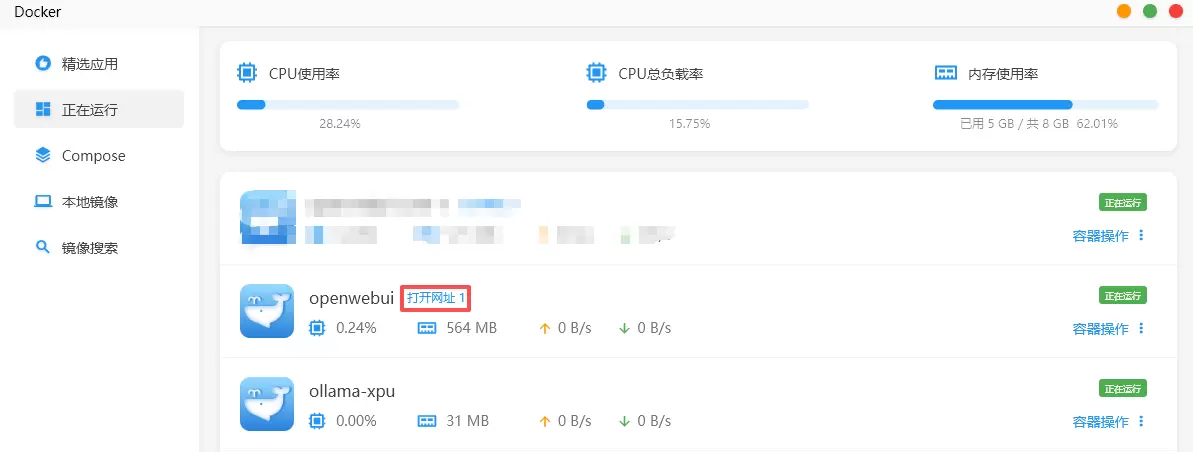 3、切换到“正在运行”列表,发现新增了两个容器。在openwebui容器名称右边有“打开网址”超链接,点击即可打开openwebui网页。