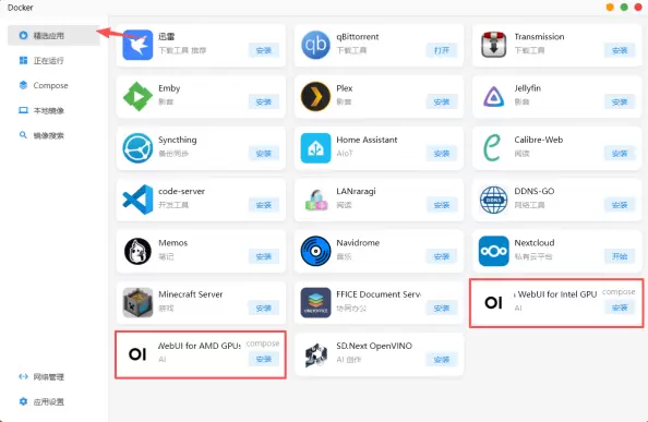 2、在“精选应用”列表找到“OpenWebUI”,点击“安装”后开始自动创建Compose,并下载OpenWebUI所需镜像。